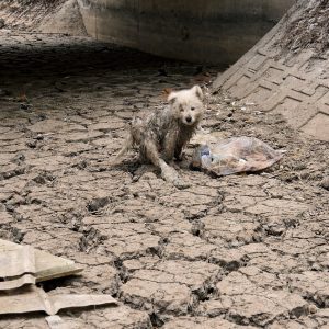 Beneath a silent bridge where the river had long since dried into cracked earth, a small white figure wandered between torn trash bags. It was a Samoyed….