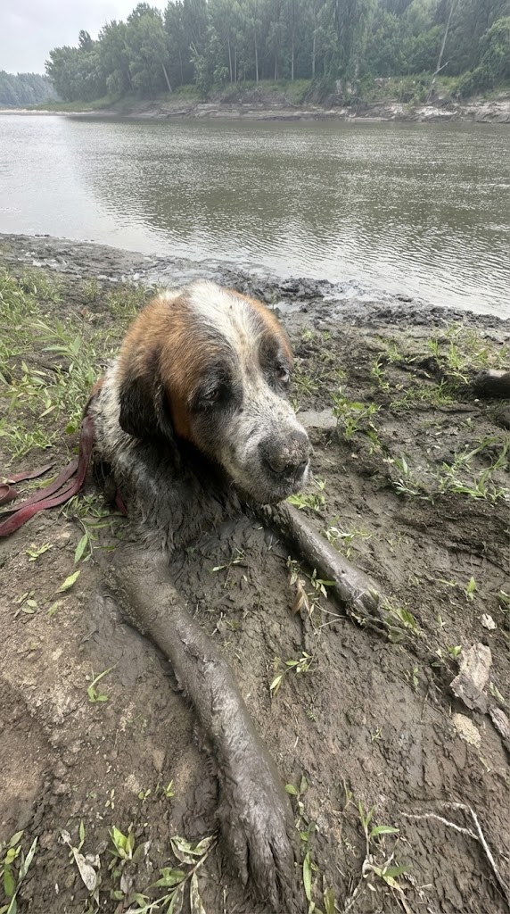 After a much-needed bath to wash away layers of river mud, Ed looked like himself again—no longer a “ghostly head” in the shoreline, but a beloved family dog safely back at home.