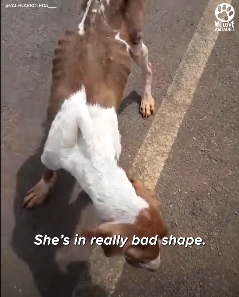 A Great Dane mix, skeletal and exhausted. Her ribs pressed sharply against her skin, her body telling a story of long-term neglect. Cars sped past her, one after another, as if she were invisible.