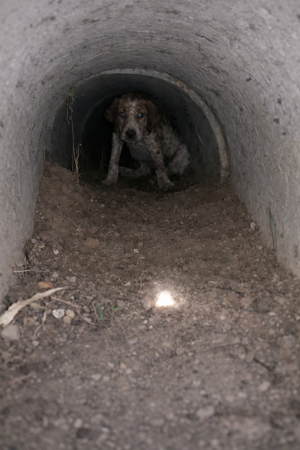 Inside, pressed tightly against the cold concrete, was a tiny puppy. Her body looked impossibly small in the dark tunnel. Her ribs were sharp against her fragile skin. Her eyes were wide—not aggressive, not even defensive—just exhausted.