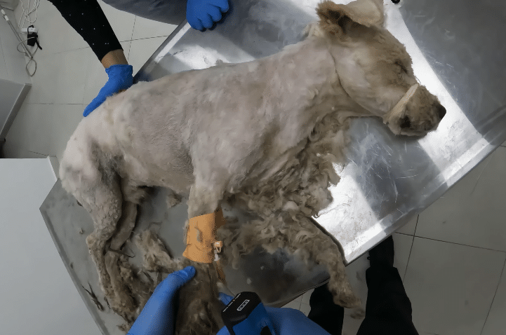 His fur had grown into thick, hardened mats that clung to him like armor. Dirt, tangled hair, and months of neglect had built layer upon layer, forming a heavy shell around his small frame. One volunteer later admitted it was the worst matting they had ever encountered.