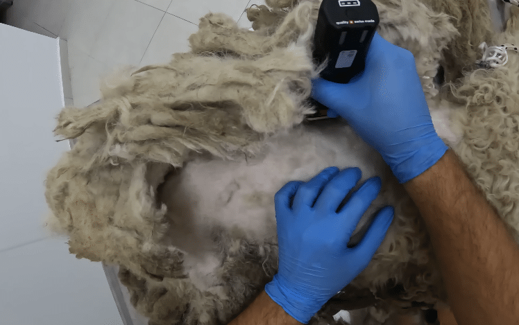 Using clippers and specialized scissors, they slowly removed the hardened mass. The most delicate areas — under the tail and around the armpits — required extreme care, where the skin had become fragile after months of pressure.