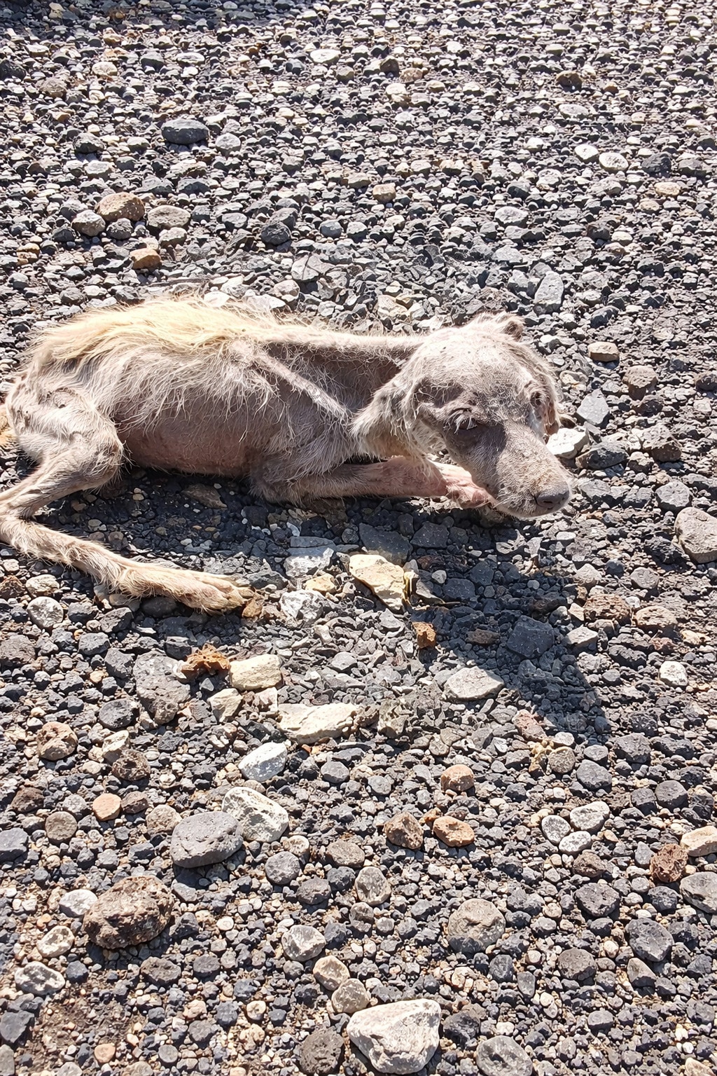 His frame was shockingly thin. Every rib was visible. His spine cut a sharp line down his back. Most of his fur was gone, replaced by thickened, irritated skin that looked painfully inflamed.