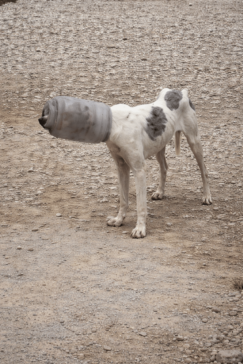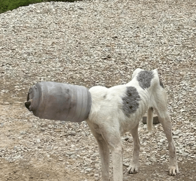 A stray dog was wandering through the area with a large plastic jar completely stuck over his head. The container covered his entire muzzle, leaving him unable to eat or drink.
