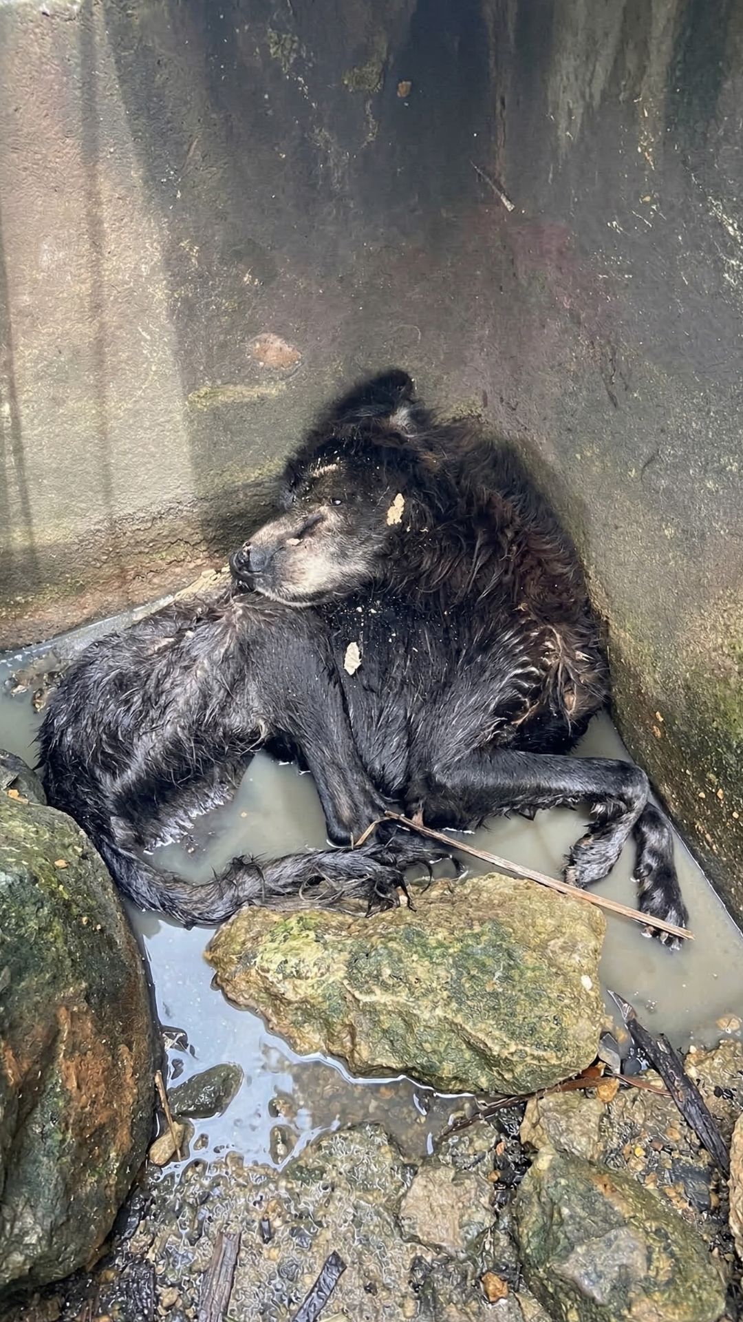 One rescuer carefully climbed down into the narrow sewer tunnel, moving slowly so he wouldn’t frighten the exhausted animal even more.