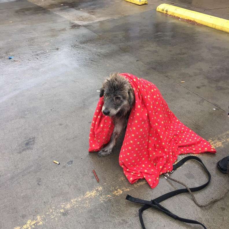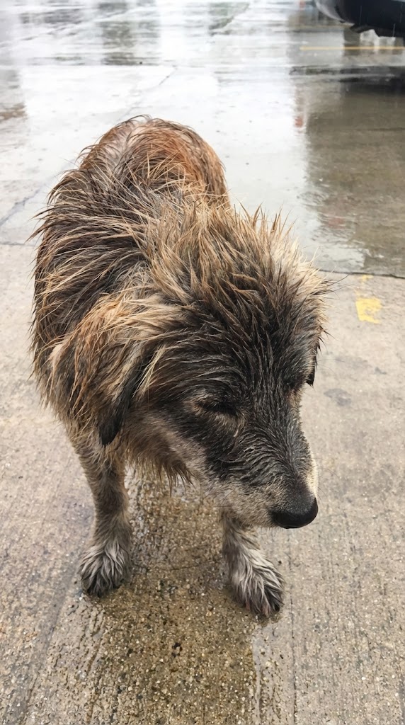Rain poured down her thin, matted fur. Her head hung low. Cars came and went.