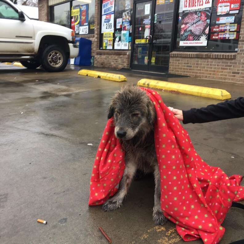 On a cold, rain-soaked morning in North Carolina, a dog stood perfectly still outside a convenience store — as if the storm had finally convinced her there was nowhere left to go.
