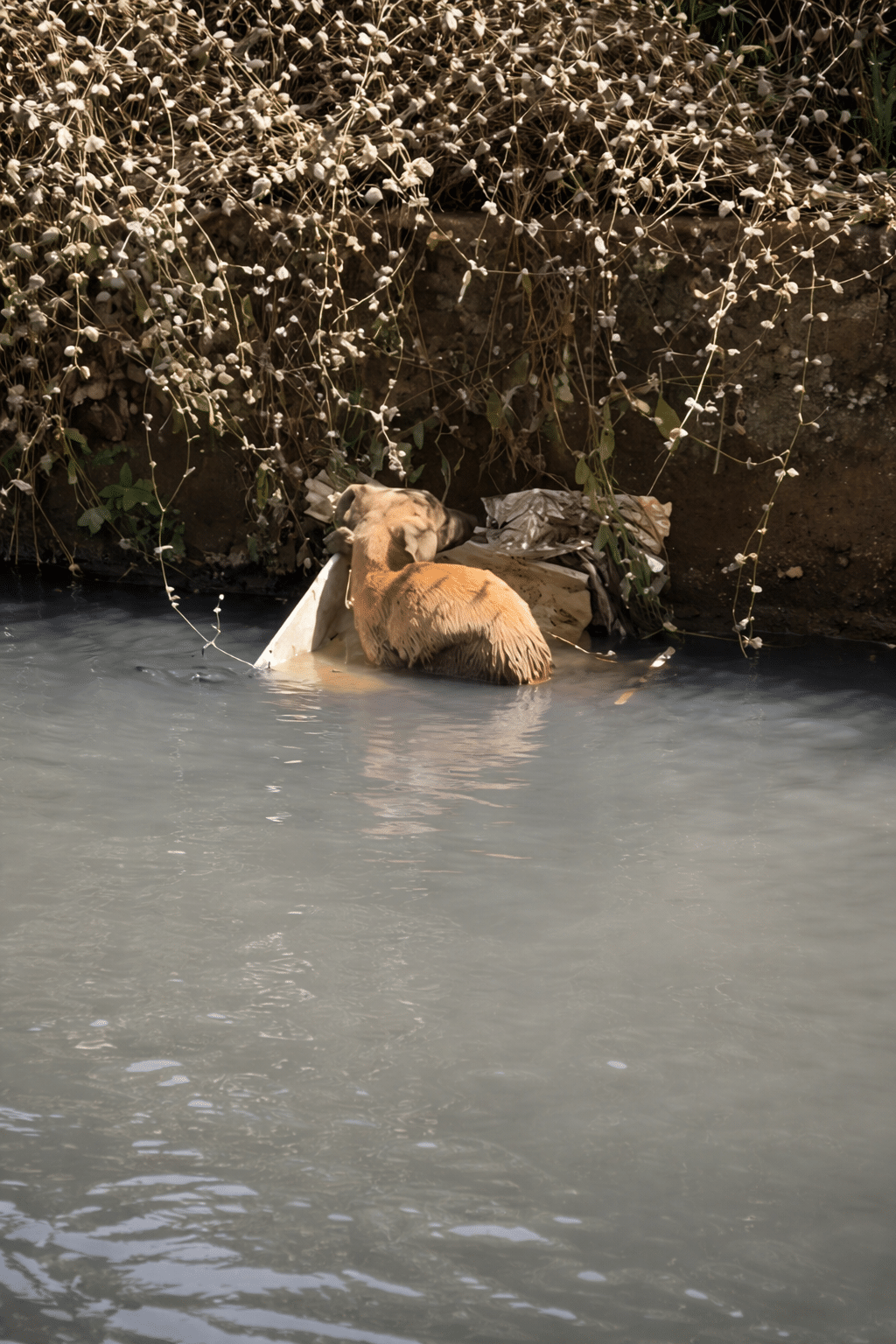 The canal was too deep for the puppy to climb out. Murky water, mud, and scattered debris made the struggle even harder. The tiny body fought just to keep its head above the surface.
