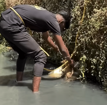 Finally, with steady hands, he lifted the small puppy out of the canal.