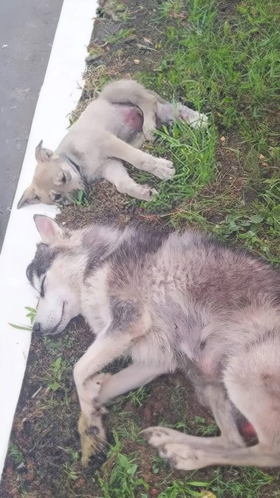 The road was quiet, but the silence felt heavy. Near the edge of the pavement, a tiny puppy lay curled on the ground, barely able to move. His breathing was shallow, his body trembling with fear and pain. Just beside him stood his mother—still, watchful, and refusing to step away. She didn’t cry out or try to run. She simply stayed, her eyes fixed on her child as if hoping someone would finally see them.