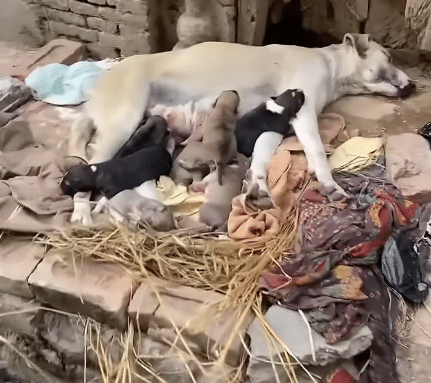 Video: A desperate mother dog stands guard as strangers step in to protect her newborn puppies from a deadly fall