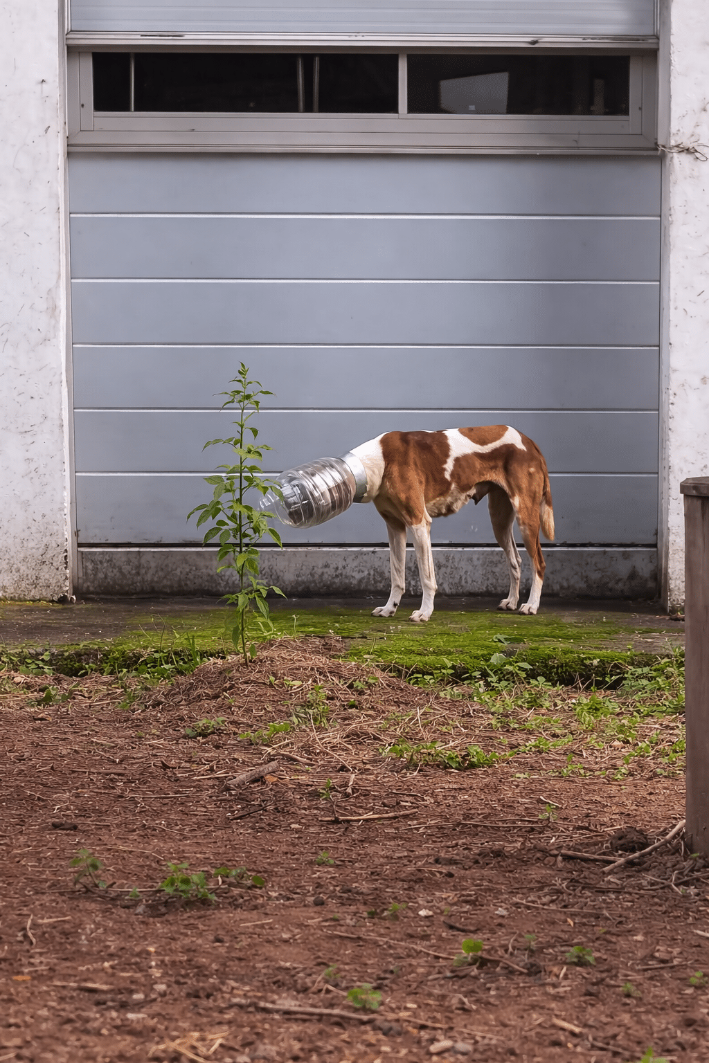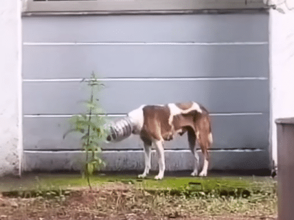 A brown-and-white stray dog moves slowly through the area, but something is terribly wrong. A large transparent plastic jar is stuck tightly over his entire head.