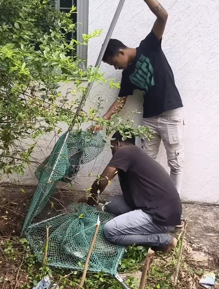 The net helps hold him still, allowing the team to approach without causing more panic or injury.