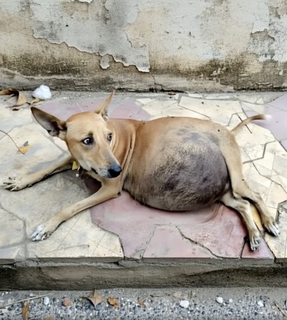 A pregnant mother dog lay motionless near the curb. Her body was twisted from the impact, her chest rising and falling in shallow, uneven breaths. Cars sped past without slowing, unaware that a life had been broken just a few feet away.