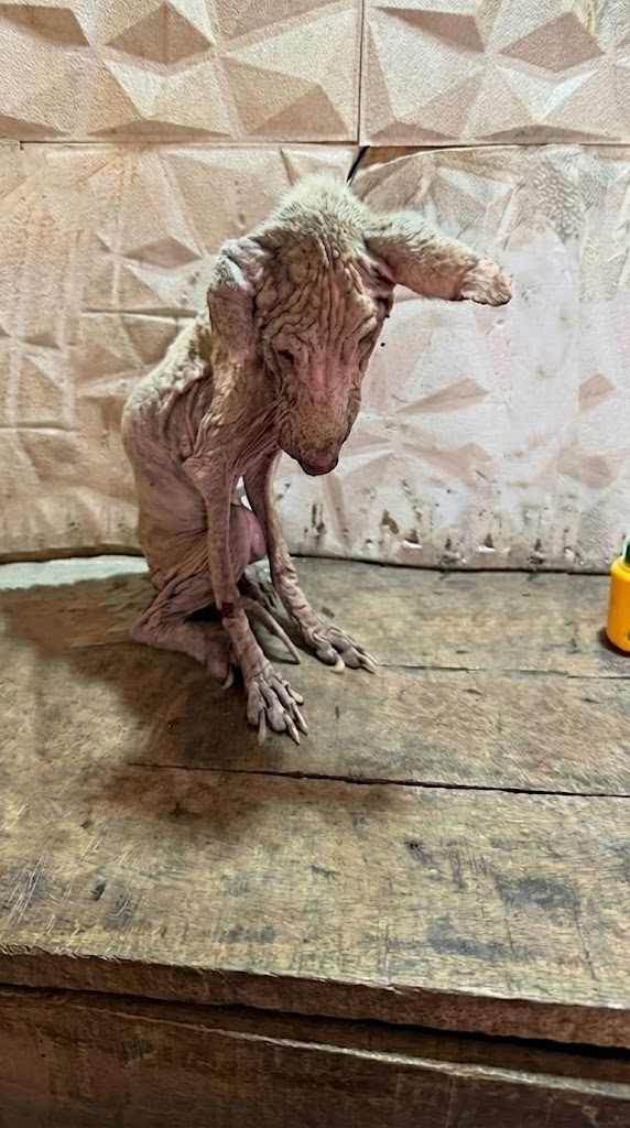 She wasn’t moving much—just standing quietly near the wall, as if even lifting her head took more effort than she had left. She didn’t look like the dogs people imagine when they think of rescues. Her body was painfully thin, her fur patchy and dull, her legs curved beneath years of neglect.