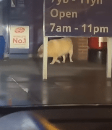 Late one night, beneath the harsh white lights of a supermarket parking lot, an elderly dog stood quietly near the automatic doors.