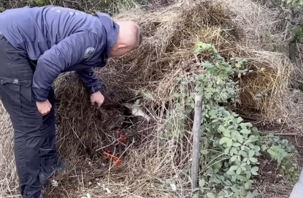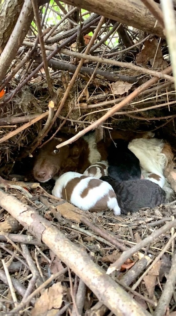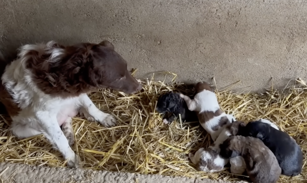 The sound led the rescuer to the corner of the shed, where dry hay had been gathered against the cold. Hidden beneath it were six tiny puppies, their bodies pressed together for warmth.