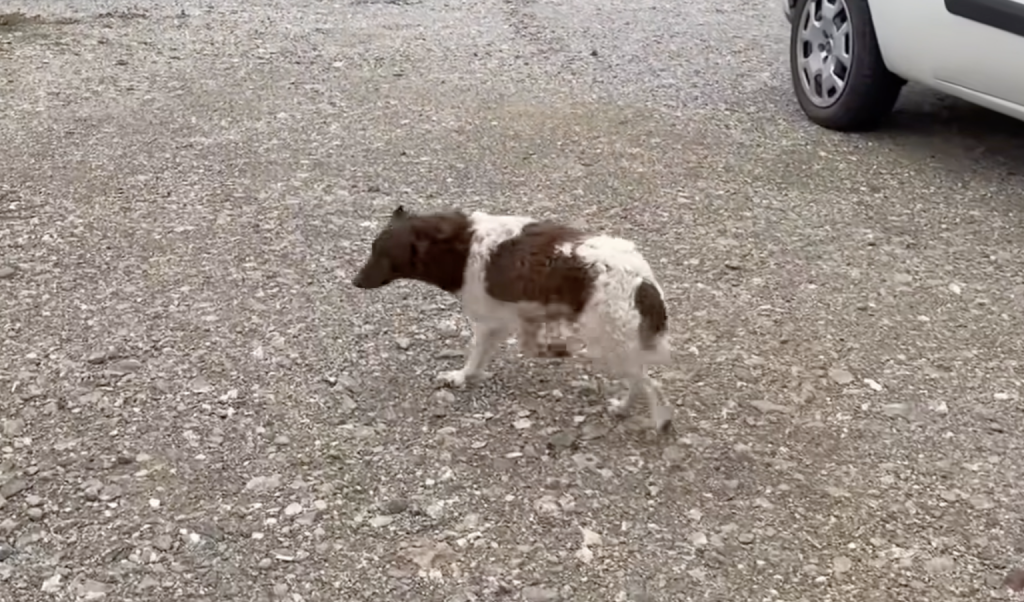 She didn’t make a sound. No barking. No pacing. She simply stood, motionless, as if she had all the time in the world. Her body was thin, her fur rough and tangled, marked by days—maybe weeks—of struggle.
