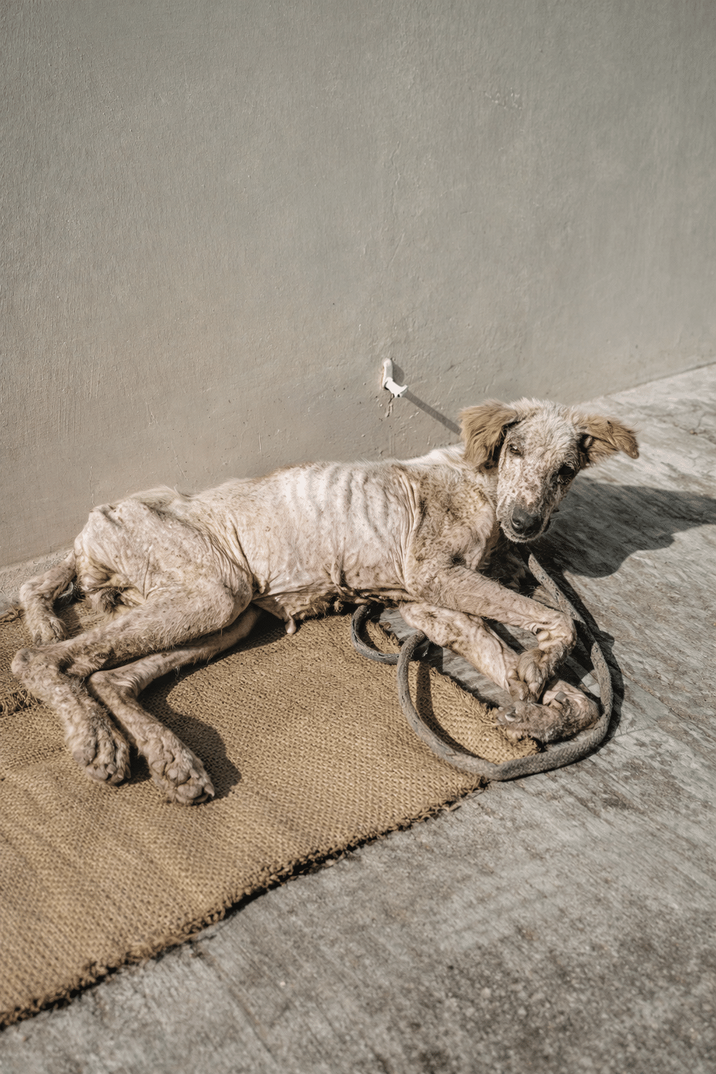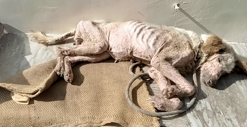 Curled near the edge of a dusty roadside, his body looked impossibly small — as if life itself had already begun to slip away. His ribs pressed sharply against thinning skin. Large bald patches revealed inflamed, irritated flesh.