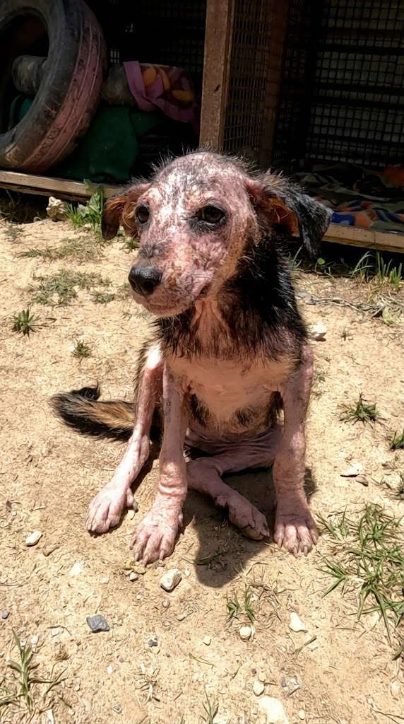 Locals began reporting a strange sight: a small, hairless figure wandering near the outskirts of town. From a distance, he didn’t even look like a dog. His fur was almost completely gone. His skin was inflamed, cracked, and covered in painful sores.