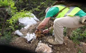 Hidden among the bushes was a dog in devastating condition—skin and bones, severely dehydrated, and suffering from a painful wound crawling with maggots.