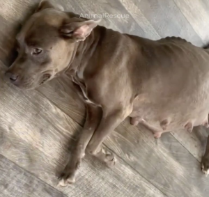 Rosemary was discovered standing exactly where someone had left her—tethered, alone, and waiting. The rope around her neck marked the boundary of her world. She was heavily pregnant, her body stretched thin by hunger and time, yet she didn’t fight when help finally came. No barking. No panic. Just the stillness of a soul that had been holding on longer than it ever should have had to.