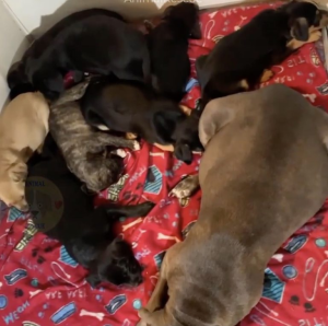 That day, thirteen puppies entered the world—tiny, fragile, and impossibly quiet at first. The room filled with soft whimpers, replacing the long silence that had defined Rosemary’s past. She became a mother with a devotion that stunned everyone. Nothing about her suffering had dulled her instinct to love.