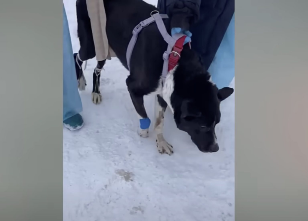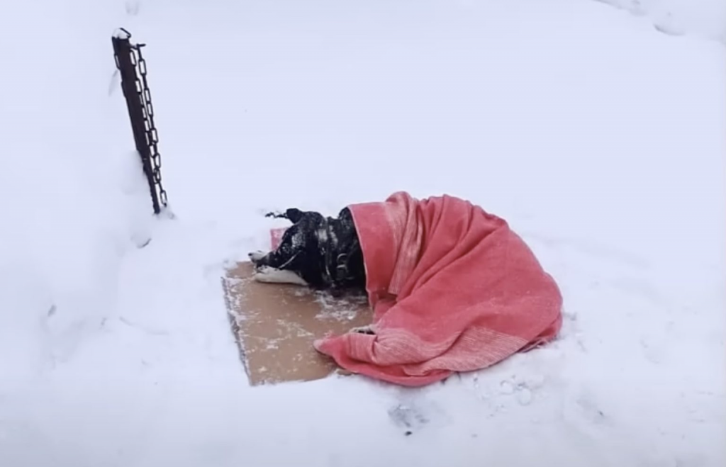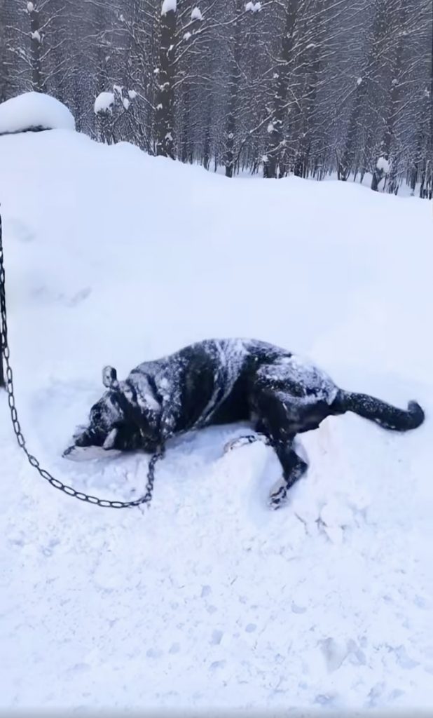 He was fastened to a wooden post by a short chain, leaving him just enough room to shift his weight, but nowhere near enough to escape the cold. Ice coated the ground beneath his paws.