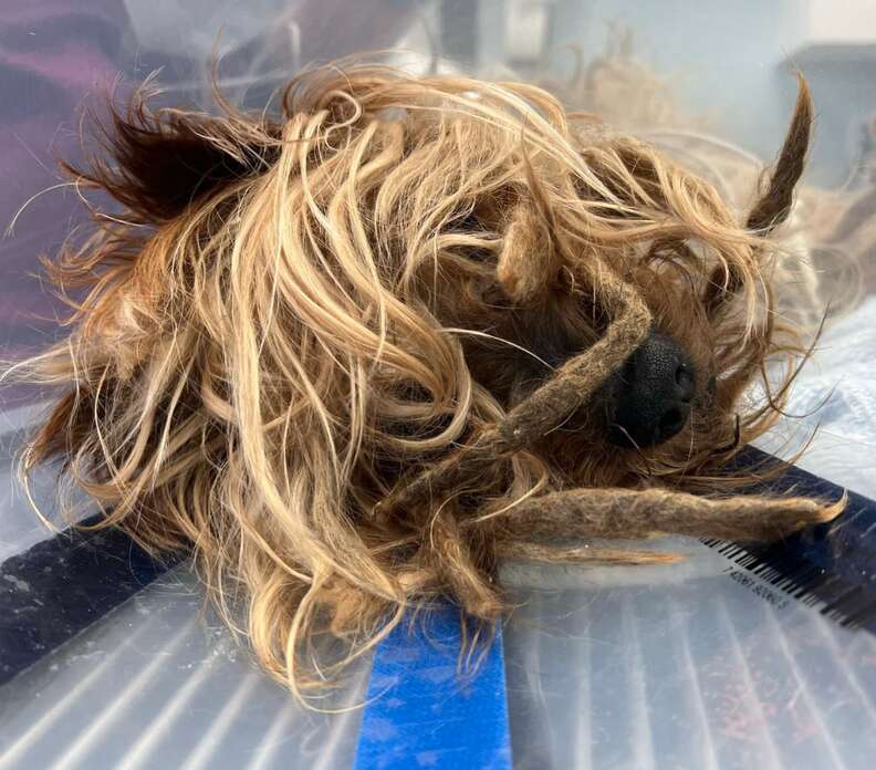 At 13 years old, his fur had never once been groomed. Over time, it hardened into thick, heavy mats that pulled at his skin with every step. The tangled coat crept over his face, sealing his eyes shut with dirt and discharge. Mickey was no longer just neglected—he was blind.