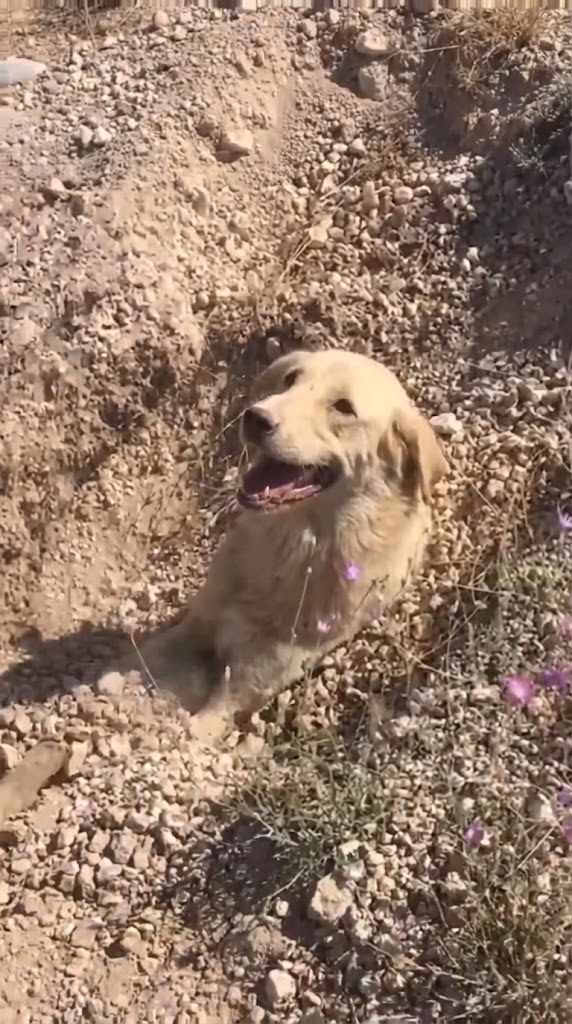 A dog’s head was protruding from the earth—nothing else visible. Her body was completely buried, trapped beneath layers of soil left behind by a sudden landslide. Only her face remained above ground, her eyes wide, exhausted, and filled with a terror that spoke of more than her own pain.