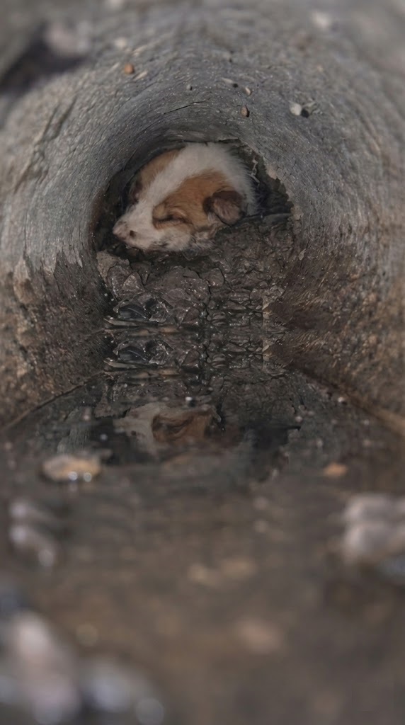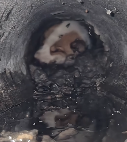 Deep inside a long, narrow concrete pipe, a tiny white-and-brown puppy lay motionless—too tired to even lift his head. His fur was packed with mud. His body barely rose and fell with each breath.