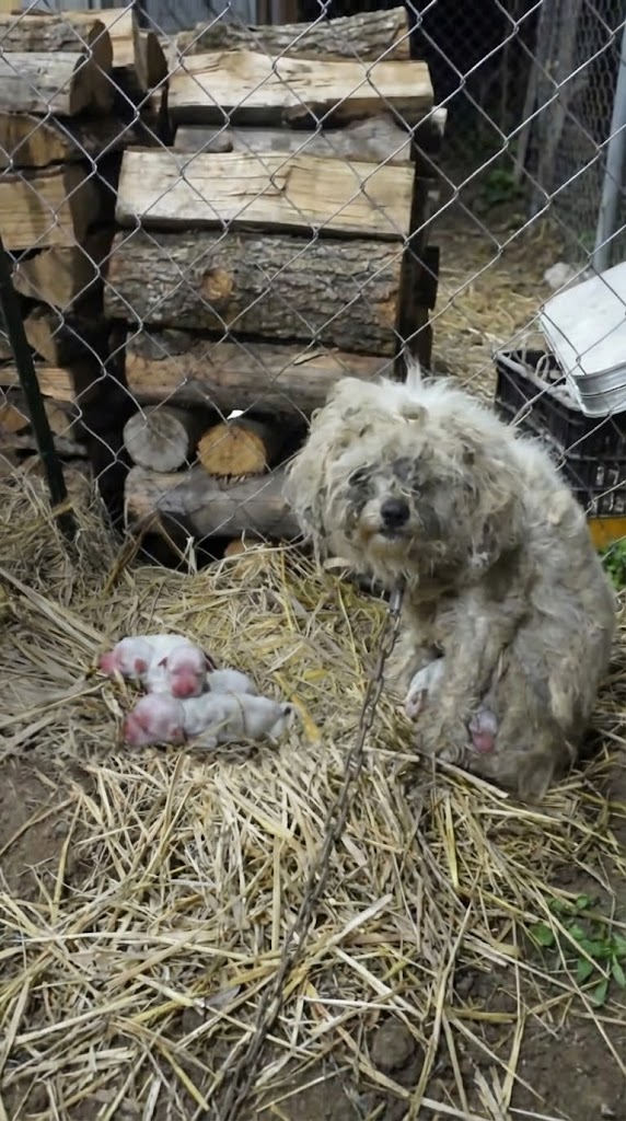 A mother dog—skinny, weak, chained tightly to a corroded metal pole. Her body curled into itself, trying to shield her newborn puppies from the cold. Snow clung to her fur. The puppies pressed against her belly, squeaking softly, searching for warmth—and milk that no longer came.