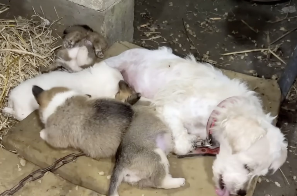 VIDEO: Chained mother dog clings to her newborn puppies, crying as hunger takes its toll