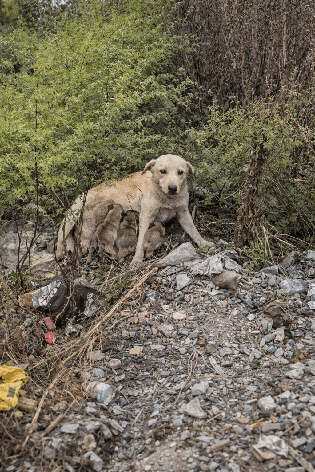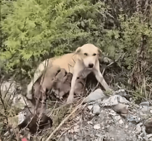 Mountains of trash, dry weeds, and broken debris cover the area. It’s the kind of place most people would pass without a second glance. But hidden among the scattered garbage, a small dog family is fighting to survive.