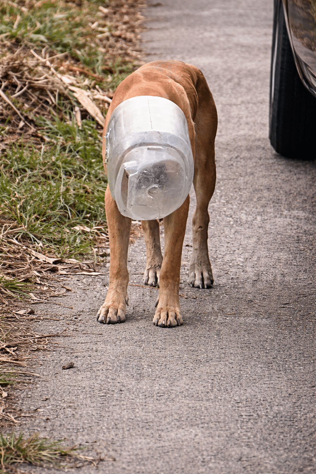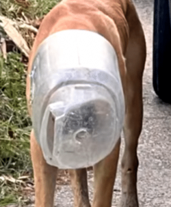 Startled and frightened, the dog bolted away with the plastic jar firmly trapped around his neck.
