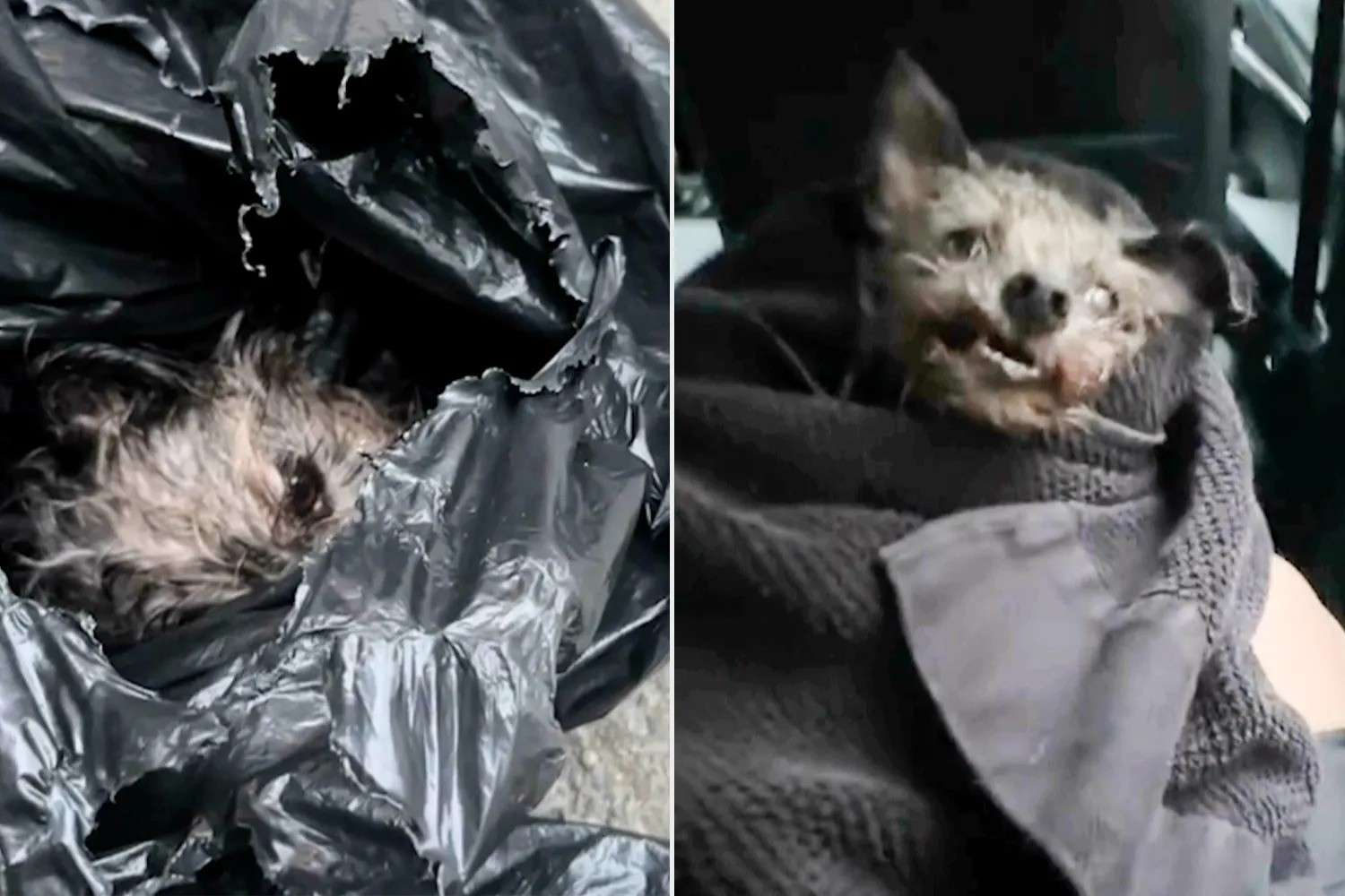 Someone had shoved a living dog into not one, but two heavy-duty garbage bags, tied them shut, and left him outside like yesterday’s waste—waiting to be crushed by a garbage truck.