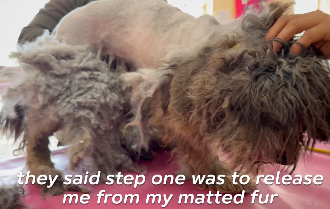 It took hours—slow, careful grooming. Every mat pulled on her skin, every snip had to be done with patience. The coat that had once been her “armor” came off piece by piece.