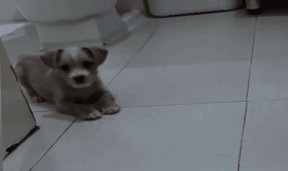 Inside the warmth of a home, the puppy stayed tense and watchful.
