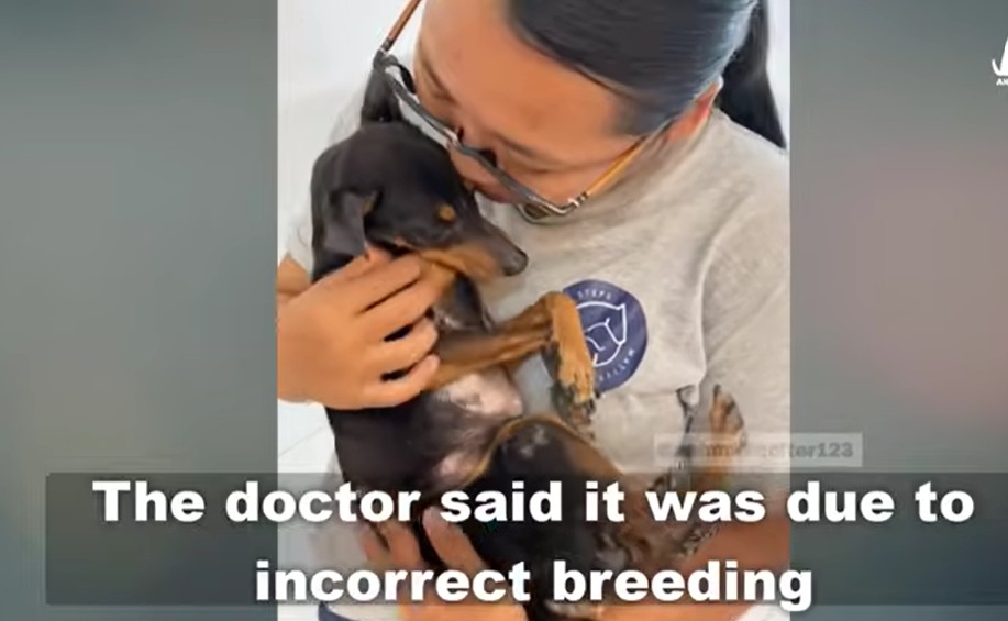 The veterinarian explained that her twisted legs were not caused by an accident.