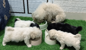 Her puppies, a mix of snowy white and soft black-and-white coats, were settled into a simple cardboard box lined with warm fabric.