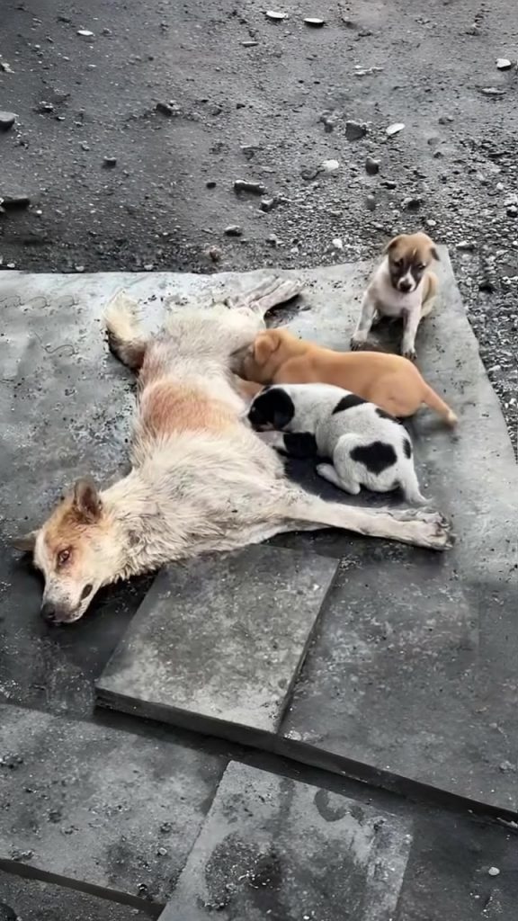 Hours turned into days. No food. No water. Injuries untreated. Still, she barely moved, curling her body protectively around her puppies and responding whenever they cried, even as her own strength slipped away.