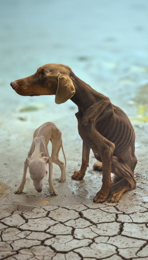 She would later be named Bono. At that moment, she was nothing more than skin stretched over bones, tied to a post with no shelter, no food, and no escape. Months of starvation had stolen her strength. Even raising her head seemed like an unbearable effort. Her eyes, dull and sunken, carried the quiet story of abandonment—of being left behind and forgotten. Yet that single pause from a stranger changed everything, not only for Bono, but for the tiny lives depending on her.