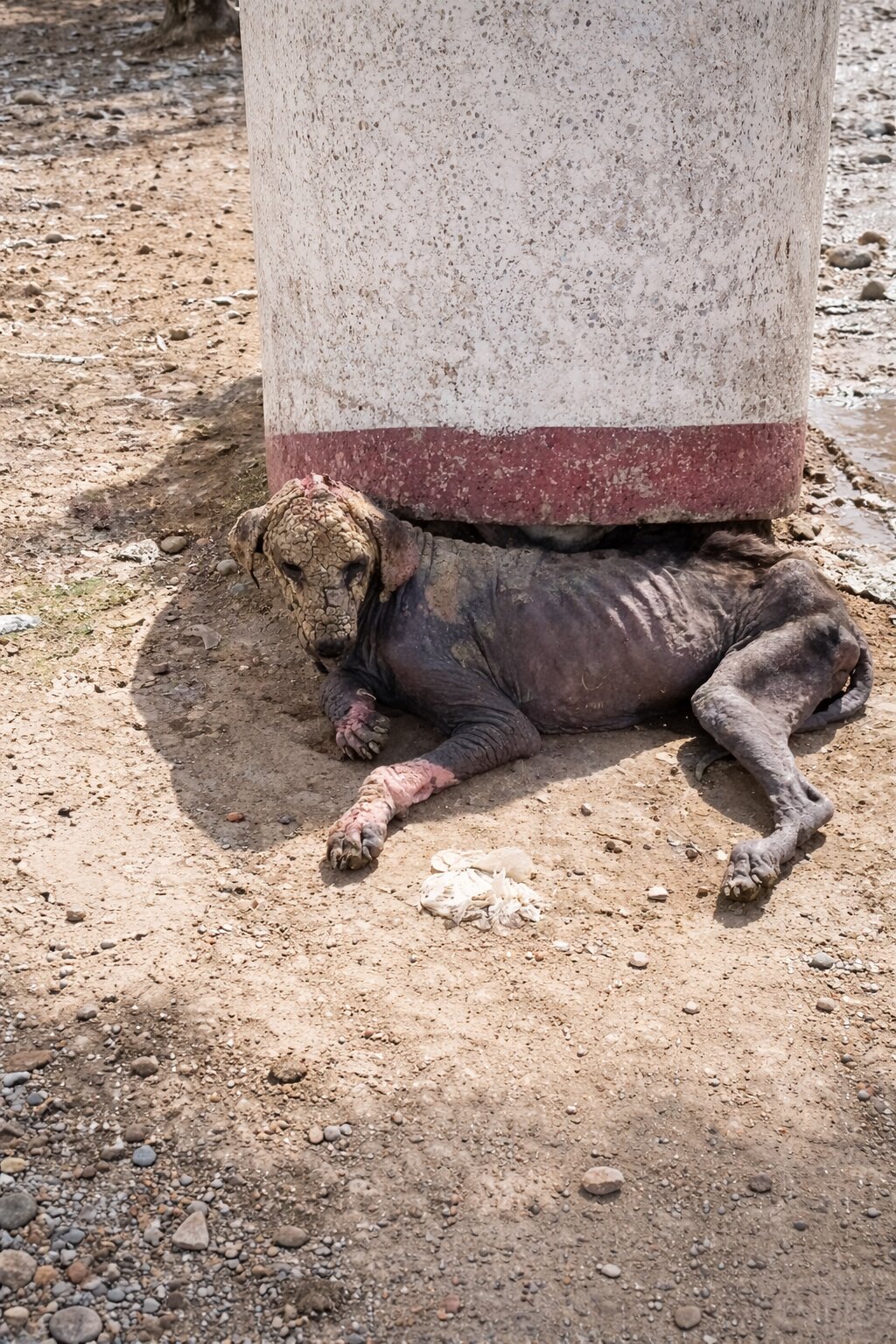 Near a quiet roadside gas station, a small dog lay barely moving—so still she almost blended into the dust around her. Her body was heartbreakingly thin, ribs sharply outlined beneath skin ravaged by thick, crusted lesions. Painful, open wounds covered her head and legs, silent proof of long-term neglect.