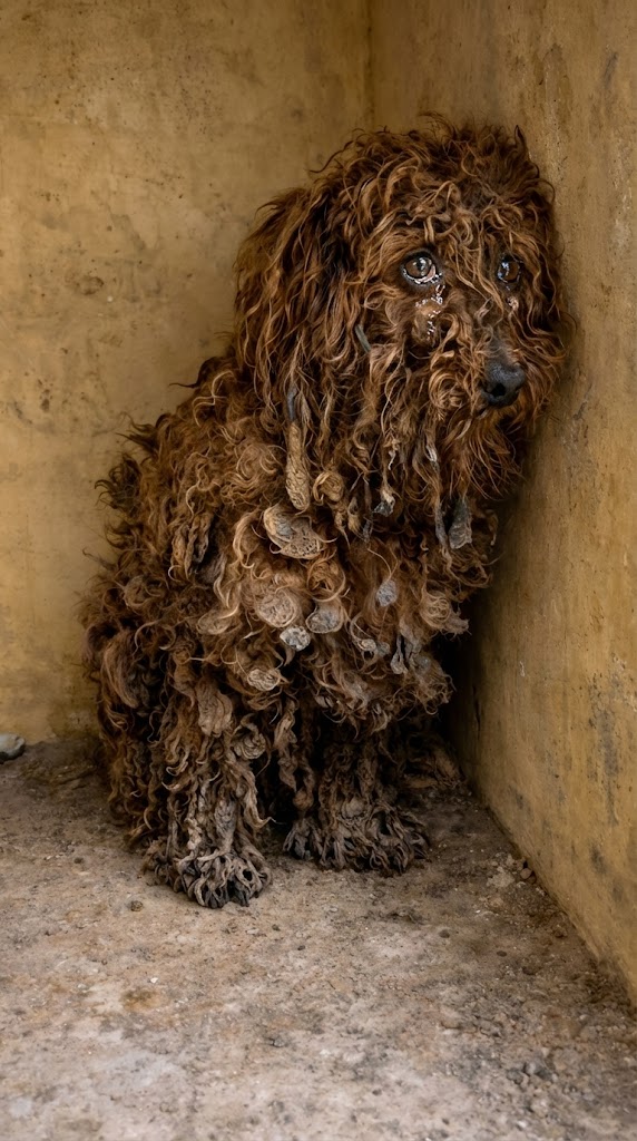 On a gray, rain-soaked afternoon, she lay tucked beside a collapsed wooden fence, her body pressed against the damp ground. She was barely more than skin and bones, her fur tangled and heavy with dirt and rain. Each breath seemed to take effort. Hunger and cold had become her daily companions, and moving even a few steps looked painful. Still, beneath her exhaustion, something flickered — a stubborn will that refused to go out completely.