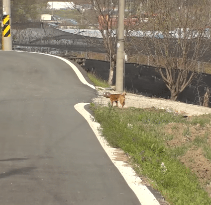 On the side of a nearly empty road, a small brown dog moved forward with hesitation.