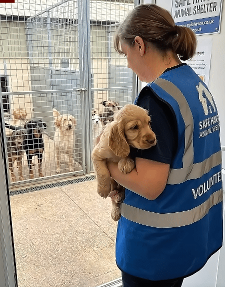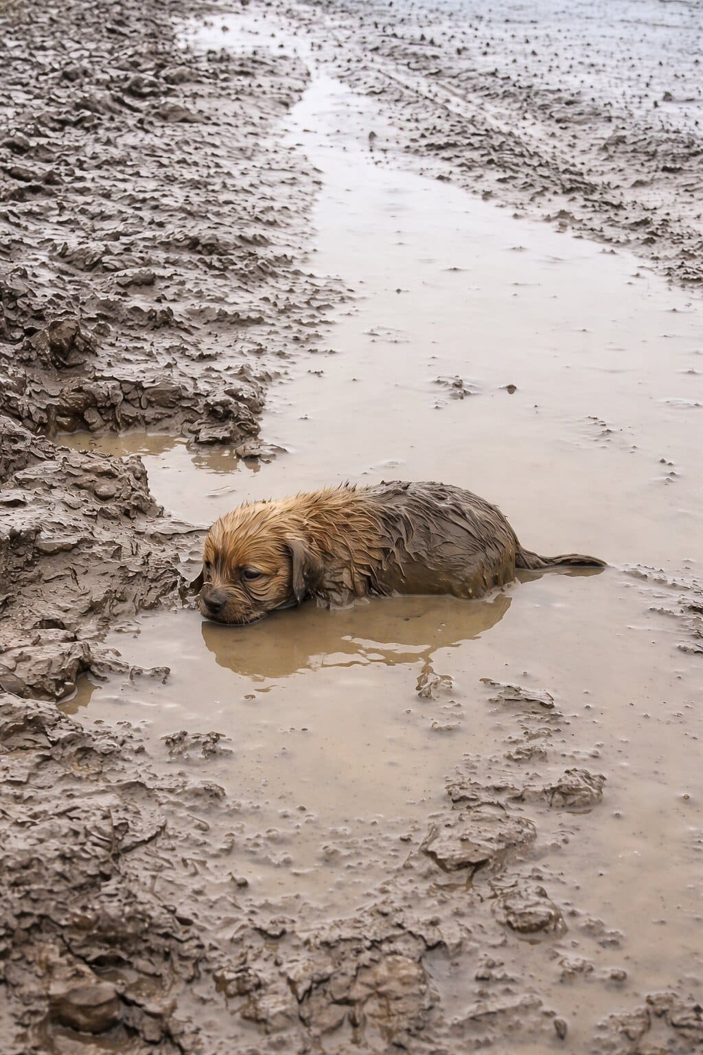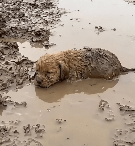 Carefully, the puppy is lifted from the mud and carried to safety. A towel wraps around him, absorbing the moisture and trying to return warmth to a body that feels dangerously close to shutting down.