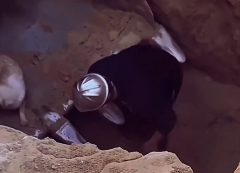 An excavator was brought in as a last hope. Slowly, the bucket descended into the pit. After a moment of hesitation, the dog climbed inside. Carefully, the machine began lifting him upward. But just before reaching the surface, fear took control. Startled by the movement and height, the dog jumped—plummeting straight back to the bottom.