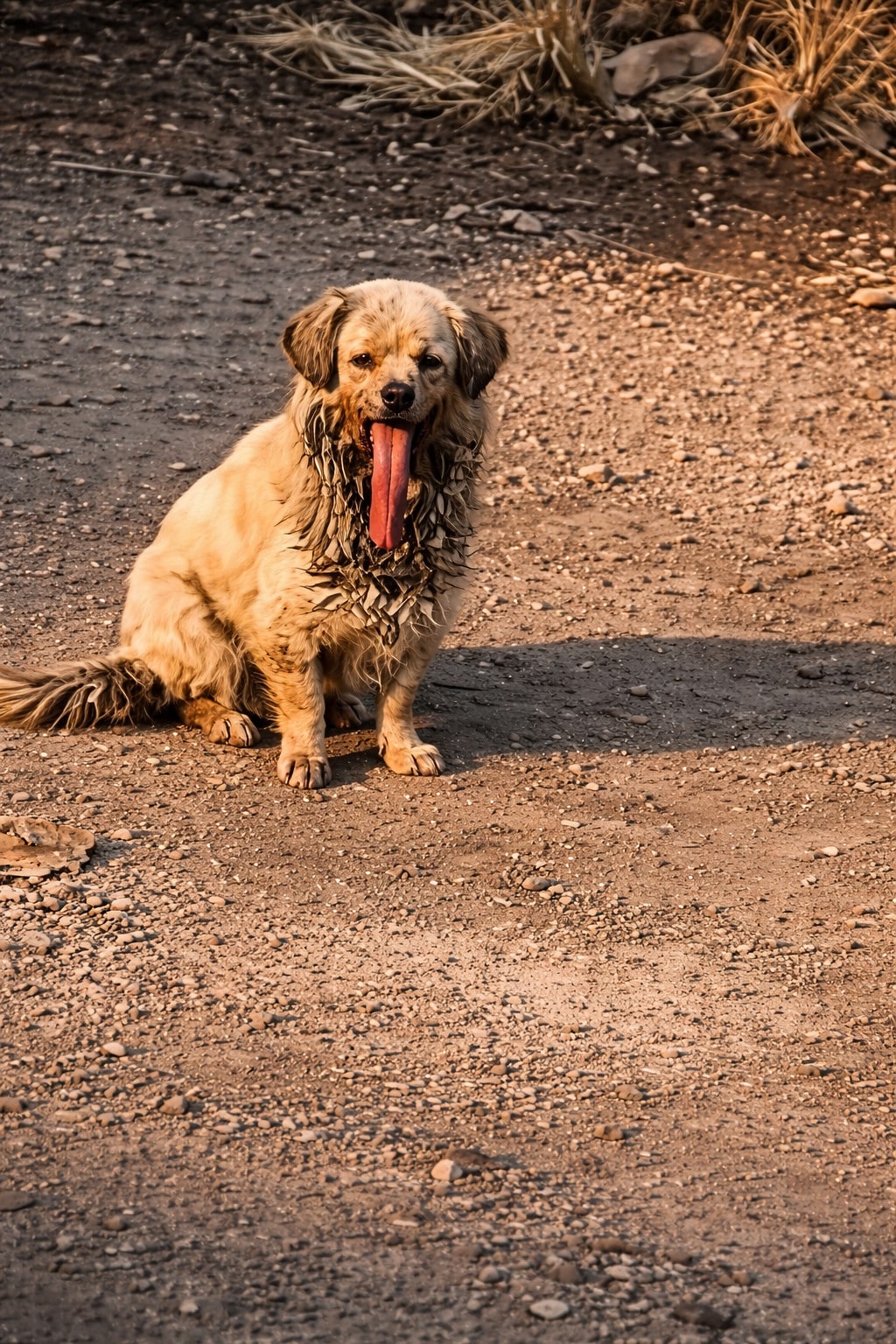 Without it, his long tongue hangs downward, permanently exposed. He can’t close his mouth. Dust settles on his tongue and clings to his rough, neglected fur. His body is painfully thin — the kind of thin that speaks of long days without enough food.