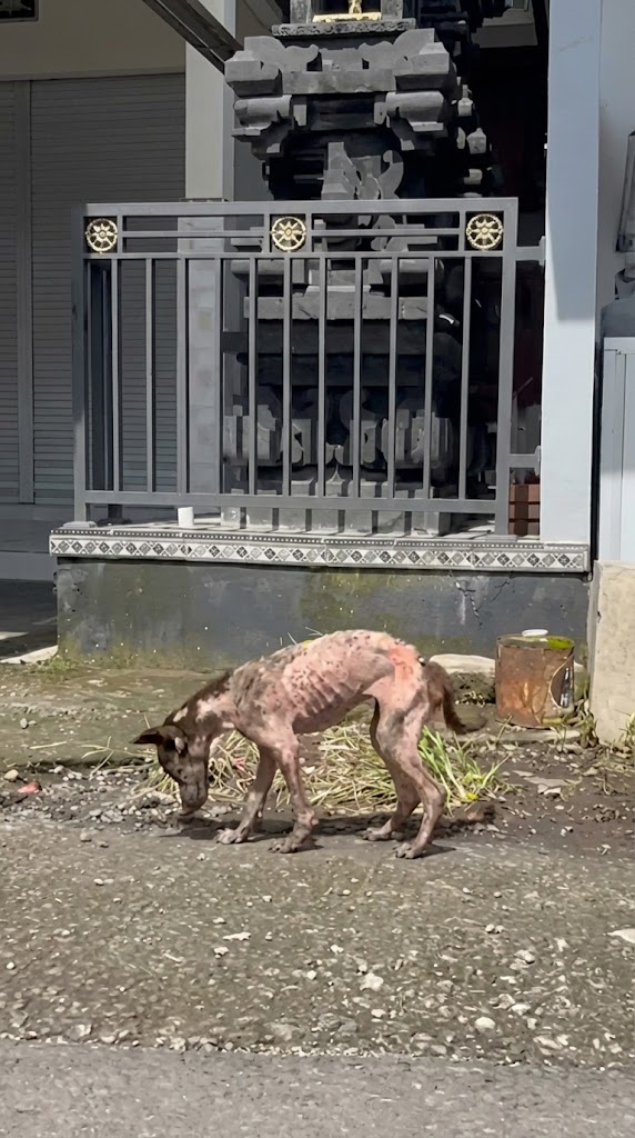 His fragile body was wrapped in thick, cracked scabs from advanced mange. His skin was inflamed and leaking from infections. He was dangerously thin—so thin that every rib, every bone, was painfully visible beneath his dry, tight skin. He moved slowly with his head lowered, eyes heavy with exhaustion, like a puppy who had already accepted the worst.
