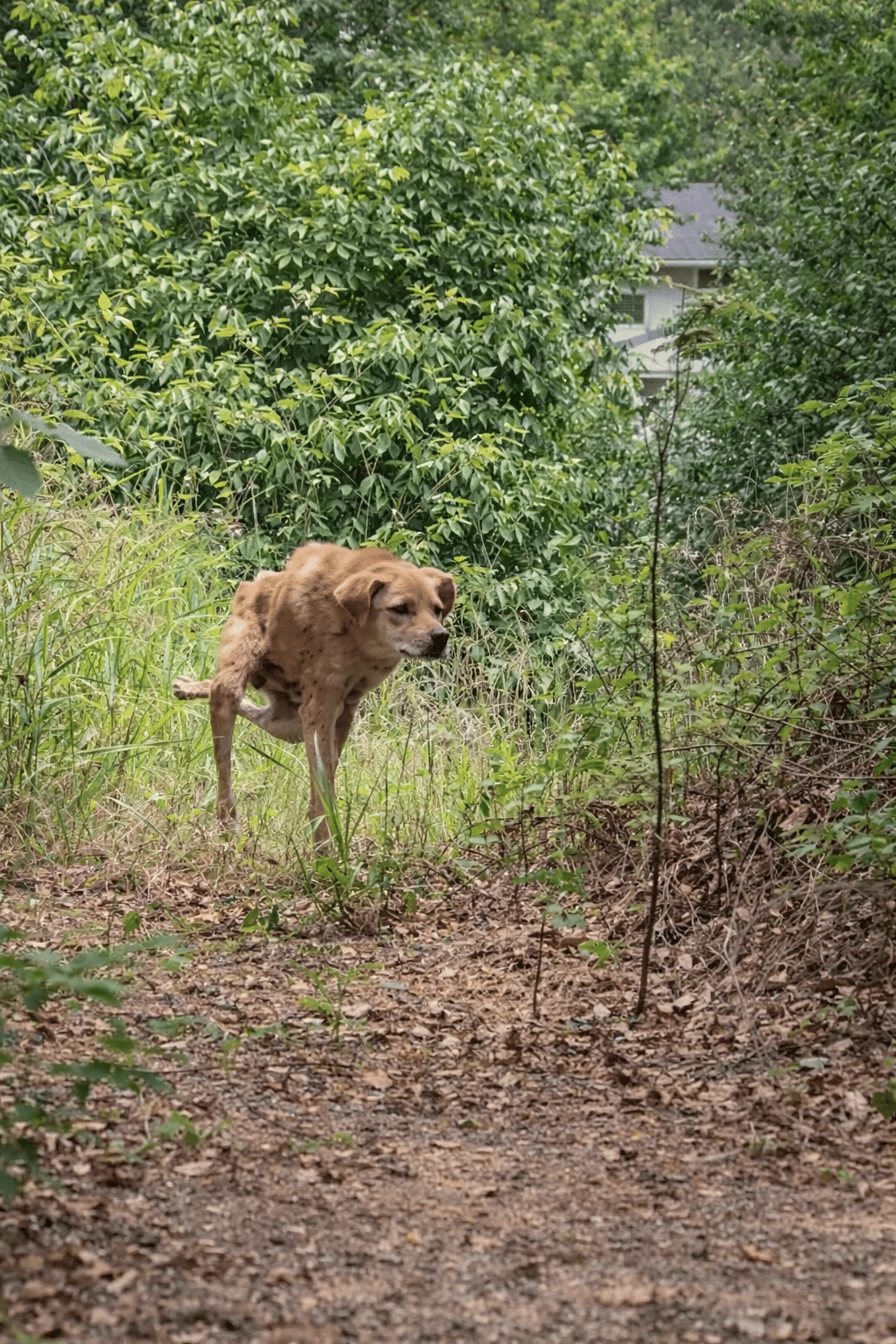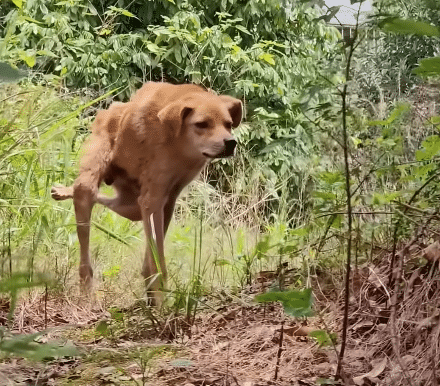 A frail stray dog drags his body through dense bushes, relying only on his front legs. His hind legs trail lifelessly behind him, completely paralyzed.